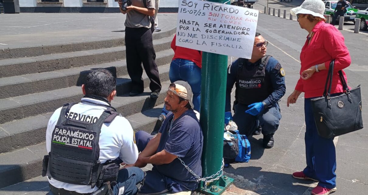 Xalapa, Ver.- Debido a que presentaba un cuadro de deshidratación por continuar encadenado en el poste de una lámpara en la plaza Lerdo el señor Juan Ricardo Ordóñez Jerez, fue atendido por paramédicos de la SSP, pero se negaba a recibir la atención médica.