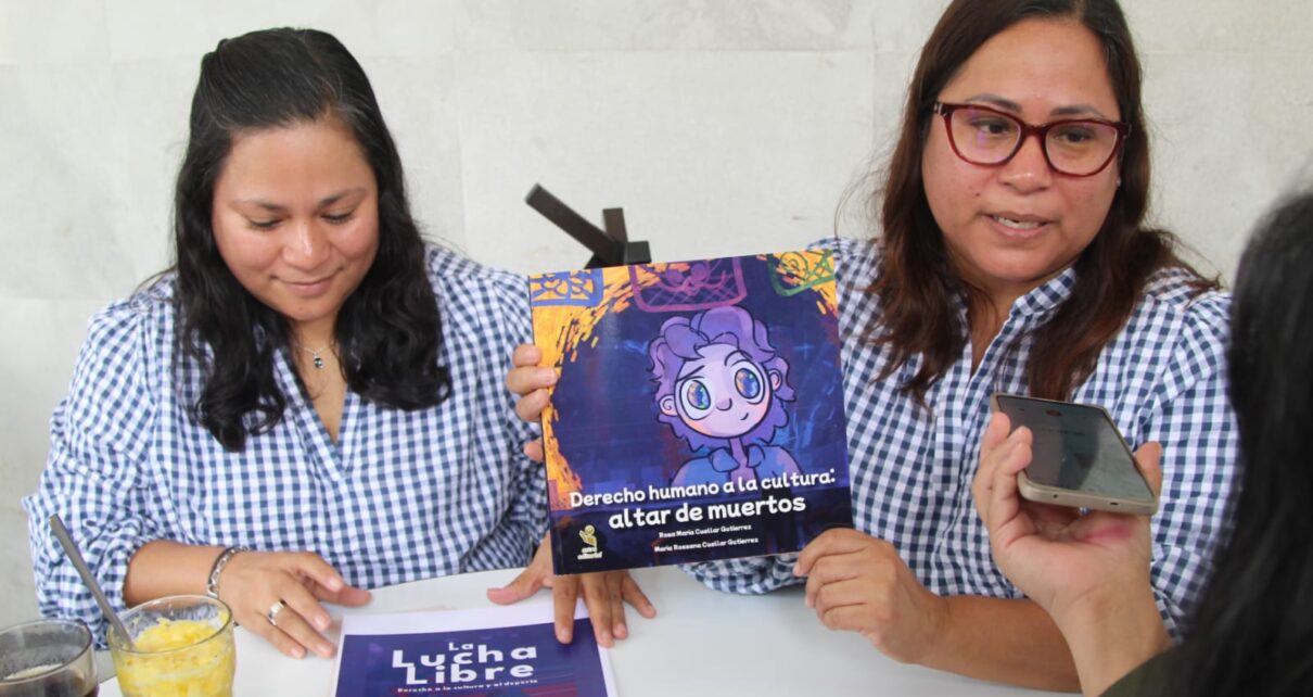 En conferencia de prensa, las catedráticas Rosa María Collar Gutiérrez y María Rosana Collar Gutiérrez, de la Universidad Veracruzana, presentan el libro “Lucha Libre” como parte de un proyecto que busca promover el derecho a la cultura y al deporte en niños.