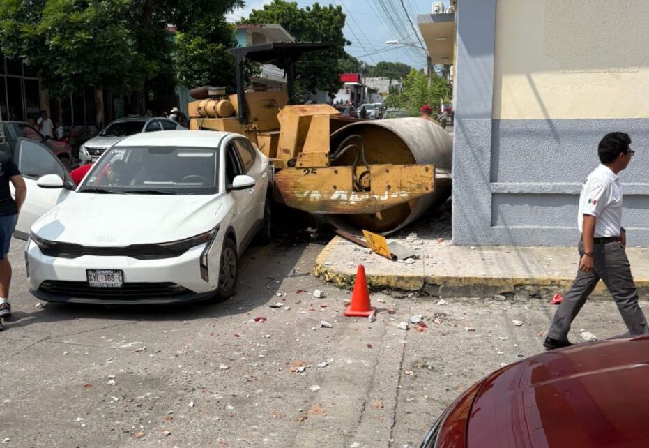 Soledad de Doblado, Ver.- Gran pánico y alerta género entre alumnos y padres de familia de la escuela particular “Cristóbal Colón” el impacto de una máquinaria pesada sobre la fachada de la institución educativa.