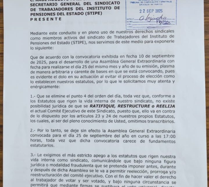 Los trabajadores señalaron que la dirigencia convocó a una Asamblea General Extraordinaria para el próximo 25 de septiembre, con el único punto a tratar es Ratificación y reestructuración del Comité Ejecutivo del Sindicato de Trabajadores del Instituto de Pensiones para el periodo 2025-2029