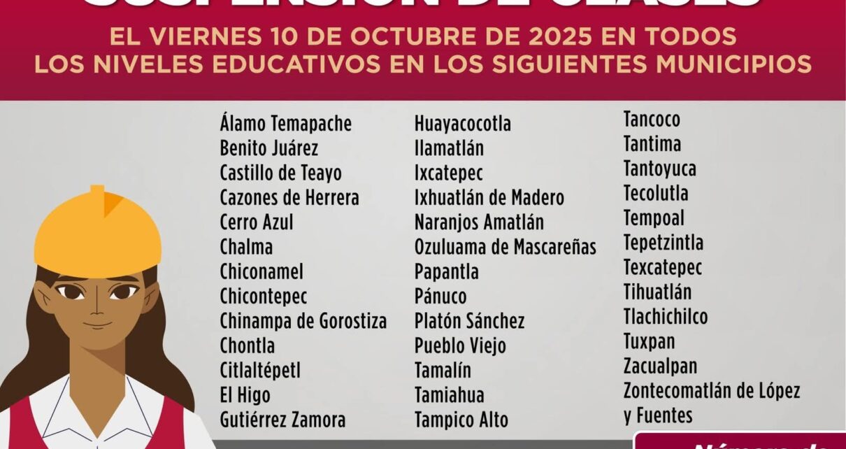 Xalapa, Ver.- Tras el análisis de los pronósticos meteorológicos, el Comité Estatal de Emergencias, en coordinación con la Secretaría de Educación, extiende la suspensión de clases y actividades administrativas en 38 municipios de la zona norte para este viernes 10 de octubre, con el objetivo de garantizar la seguridad de estudiantes, docentes y personal escolar: