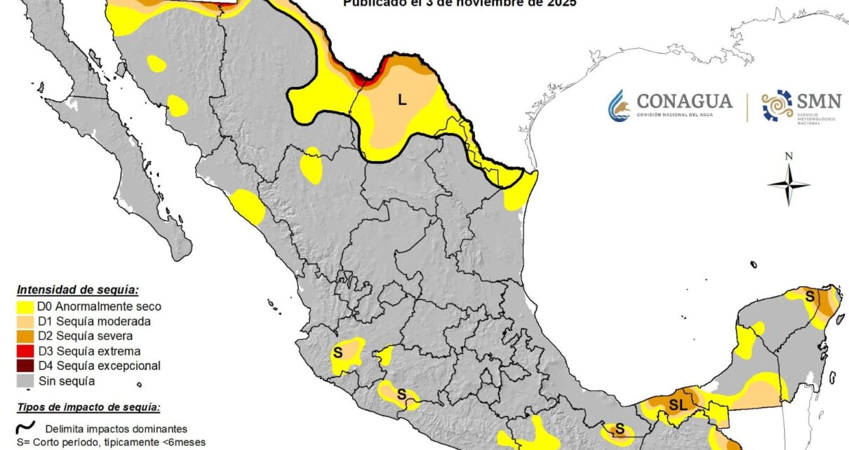 La especialista explicó que durante la segunda quincena de octubre se observó una intensificación de la sequía en la región sur, especialmente en municipios pertenecientes a la cuenca del río Coatzacoalcos, donde las condiciones pasaron de sequía moderada (D1) a severa (D2).