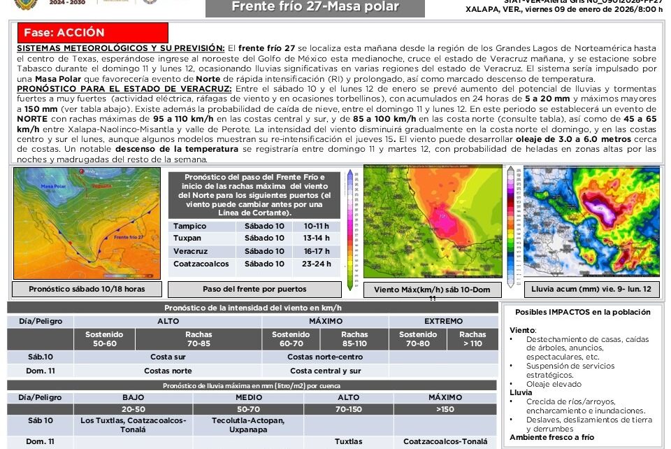Xalapa, Ver.- La Secretaría de Protección Civil del Estado emitió una Alerta Gris, en su fase de Acción, ante la probabilidad de efectos asociados al evento de Norte y al Frente Frío número 27, los cuales comenzarán a impactar el territorio veracruzano a partir de este sábado 10 de enero.