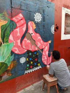 “Tenemos 15 artistas jóvenes y adultos, este proyecto es colectivo, y lo estamos haciendo con entusiasmo para embellecer este callejón, y es algo voluntario. Con los decimistas, nosotros los pintores nos estamos pasando con el tema de los decimistas, de acuerdo a la décima es lo que nosotros hacemos plasmando en esos muros, primero Dios, cuando sea la inauguración es lo que la ciudadanía va a interpretar, de acuerdo a la décima que tú vayas leyendo es lo que tú vas a ver de imagen”, menciona en entrevista el muralista, Ricardo Cortés Camacho.
